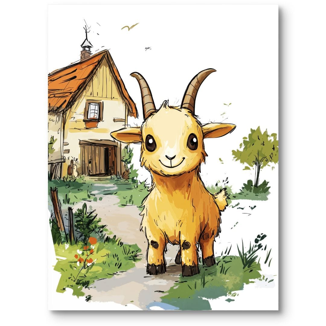 Na tym plakacie centralną postacią jest urocza koza, stojąca przed klimatycznym, wiejskim domem. Malownicza sceneria emanuje spokojem i przywołuje wspomnienia sielskiej prowincji. Sympatyczna mina zwierzęcia podkreśla lekkość i radosny charakter kompozycji.