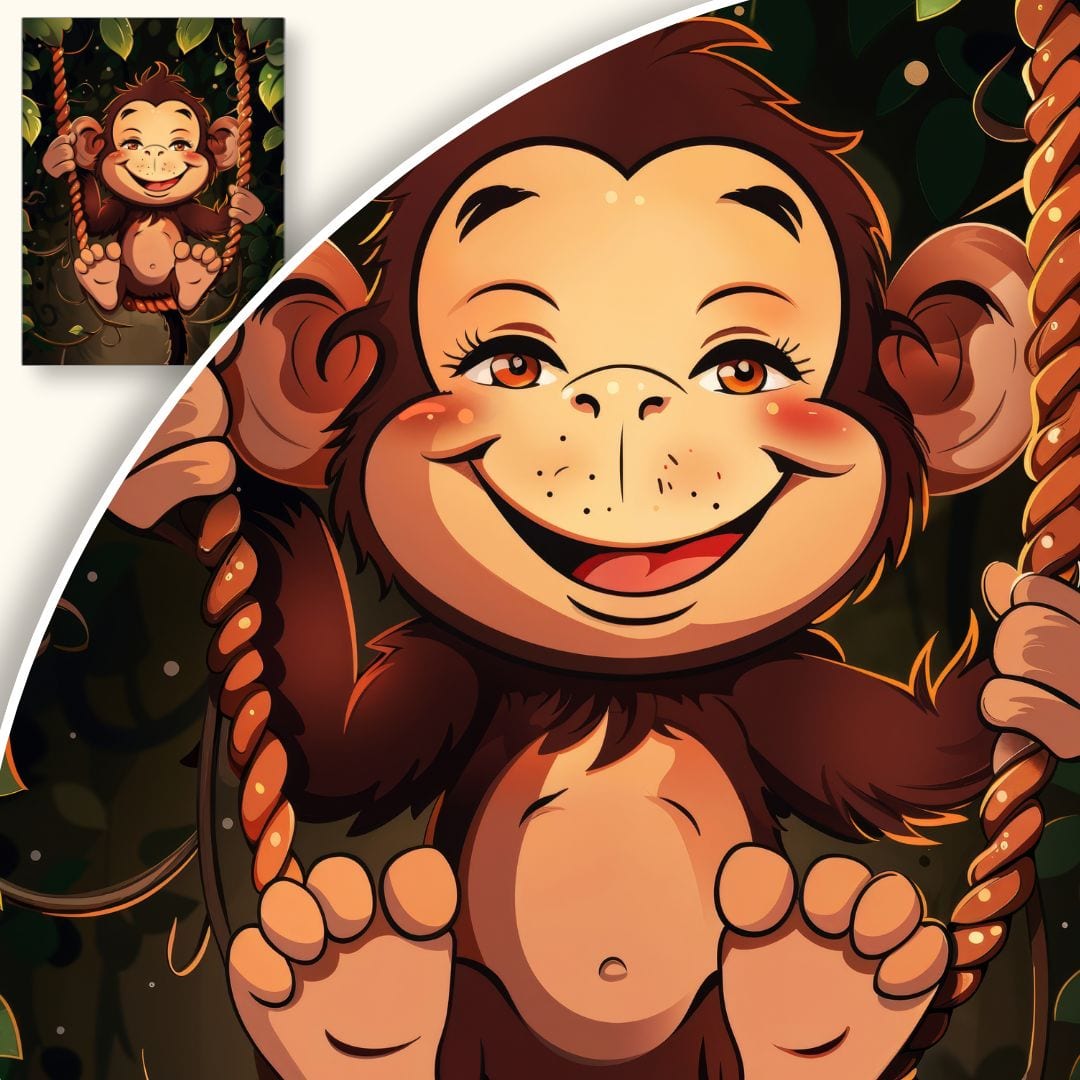 Plakat prezentuje uroczą, uśmiechniętą małpkę wypoczywającą na lianie wśród bujnej tropikalnej zieleni. Pogodny wyraz twarzy zwierzęcia i jego zrelaksowana poza wprowadzają radosną, beztroską aurę charakterystyczną dla niebanalnych ilustracji dedykowanych dzieciom.