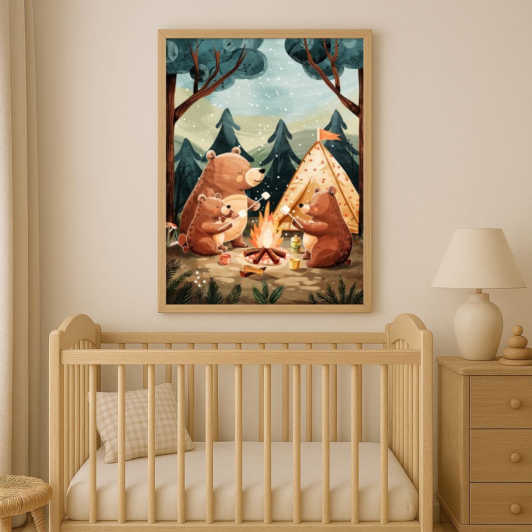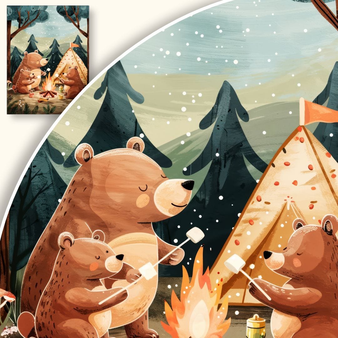 Plakat przedstawia urocze niedźwiadki podczas biwakowania w gęstym lesie. Trzy sympatyczne misie siedzą razem wokół ogniska, piekąc pianki na patykach – atmosfera beztroski i przygody zachęca do wspólnego spędzania czasu. W tle widoczny jest klimatyczny namiot, a zalesione wzgórza budują poczucie bliskości natury.