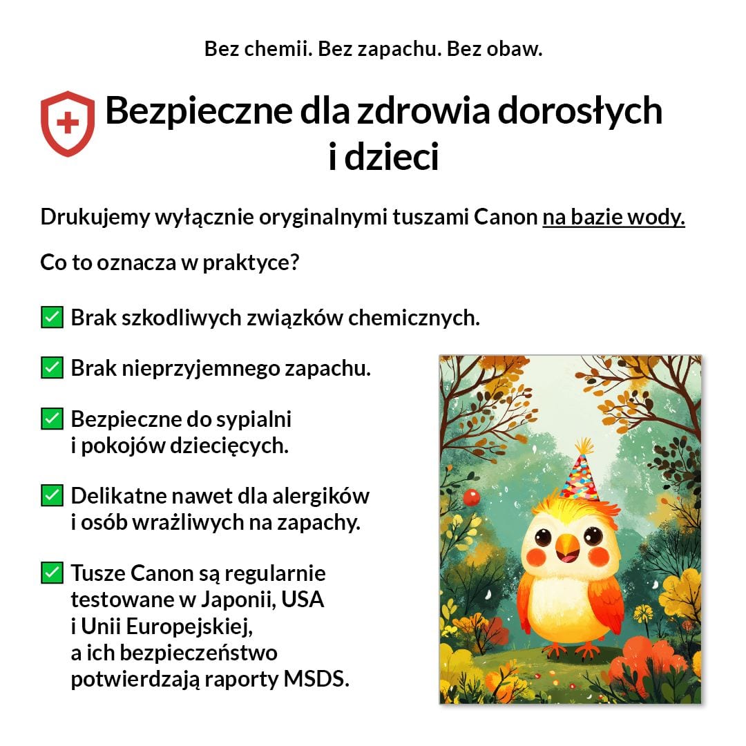 Tak, absolutnie! Drukujemy wyłącznie certyfikowanymi, bezwonnymi tuszami pigmentowymi Canon Lucia Pro na bazie wody. Są one w pełni bezpieczne dla zdrowia, nie zawierają rozpuszczalników i mogą być bez obaw stosowane w sypialniach i pokojach dziecięcych.