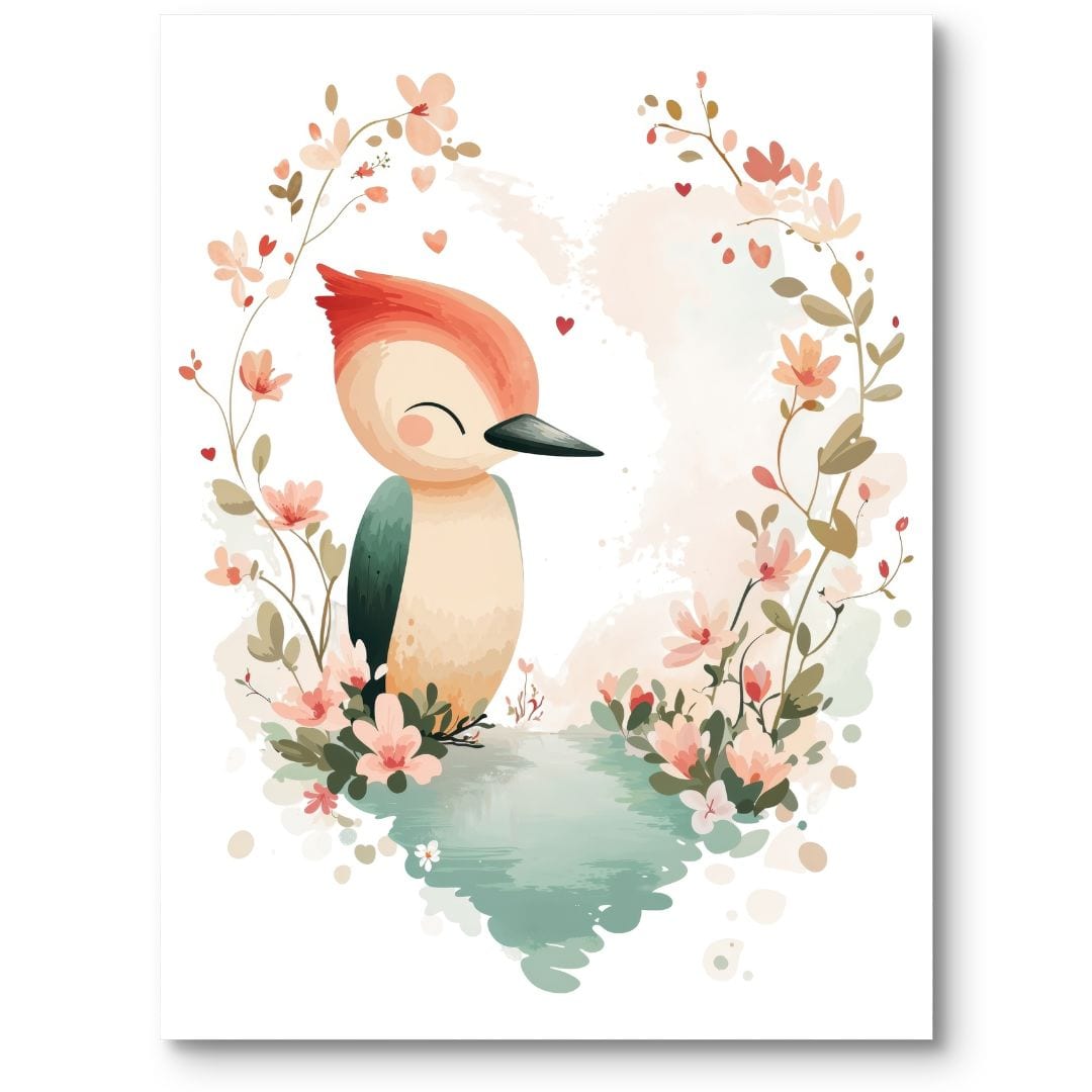 Ten uroczy plakat przedstawia sympatycznego ptaka otoczonego subtelnymi kwiatami o pastelowych odcieniach. Ptak, siedząc z zamkniętymi oczami, emanuje spokojem i radością, przywołując na myśl harmonijny kontakt z naturą oraz dziecięcą beztroskę. To niezwykle wdzięczna propozycja do pokoju dziecka, które uwielbia przyrodę i delikatne, pozytywne motywy.
