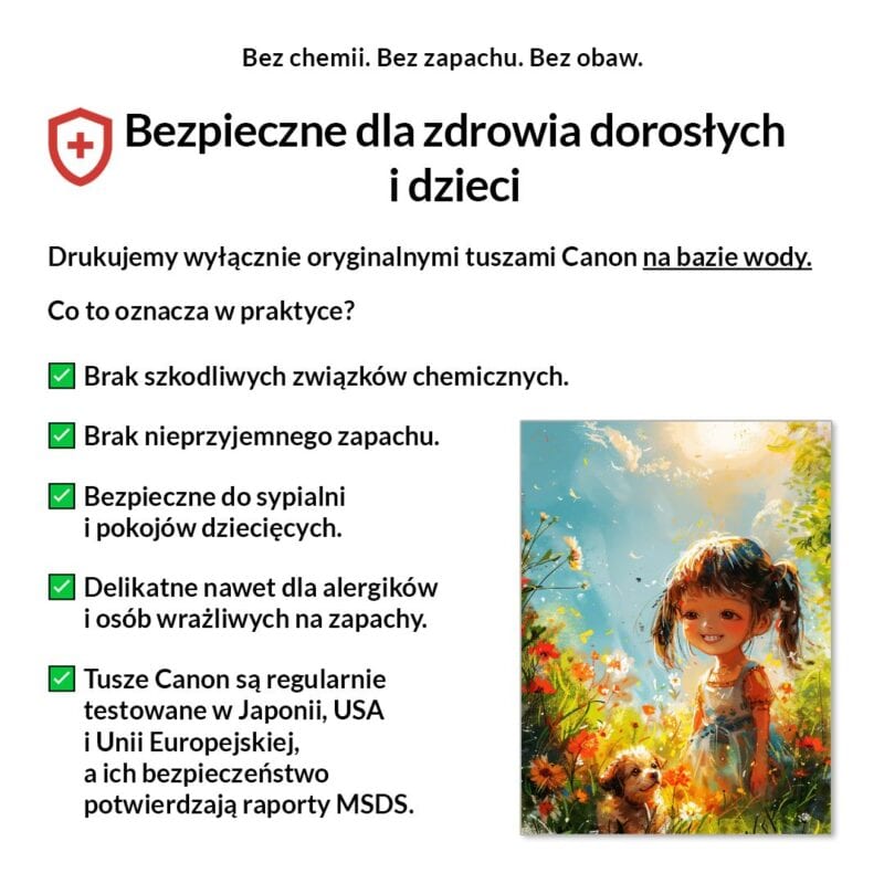 Tak, absolutnie! Drukujemy wyłącznie certyfikowanymi, bezwonnymi tuszami pigmentowymi Canon Lucia Pro na bazie wody. Są one w pełni bezpieczne dla zdrowia, nie zawierają rozpuszczalników i mogą być bez obaw stosowane w sypialniach i pokojach dziecięcych.