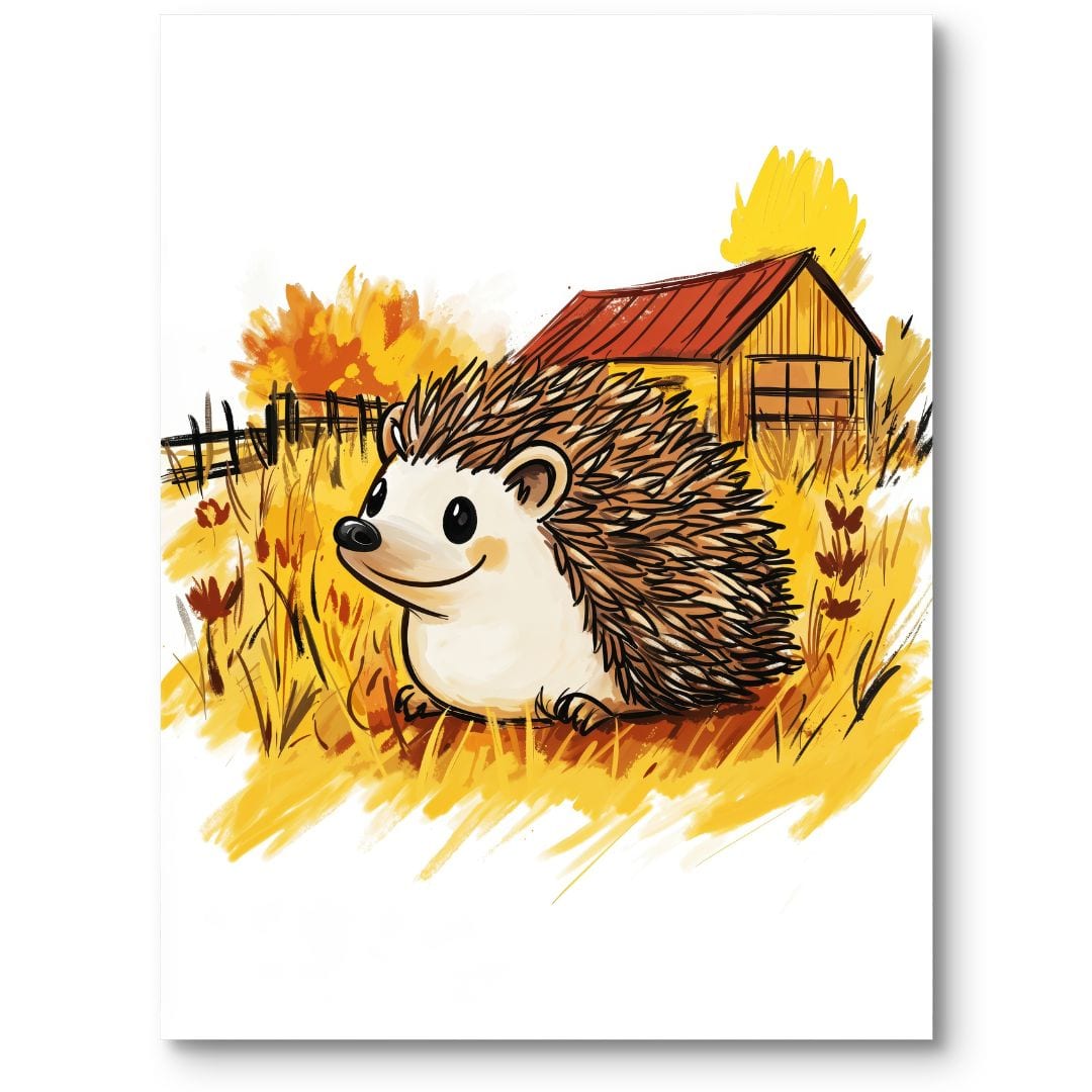 Obraz na płótnie ukazuje urokliwy, wiejski pejzaż z radosnym jeżem na tle złocistych pól i czerwonej stodoły. Ta idylla emanuje ciepłem i urokiem, przenosząc widza w świat sielanki i prostoty życia blisko natury.