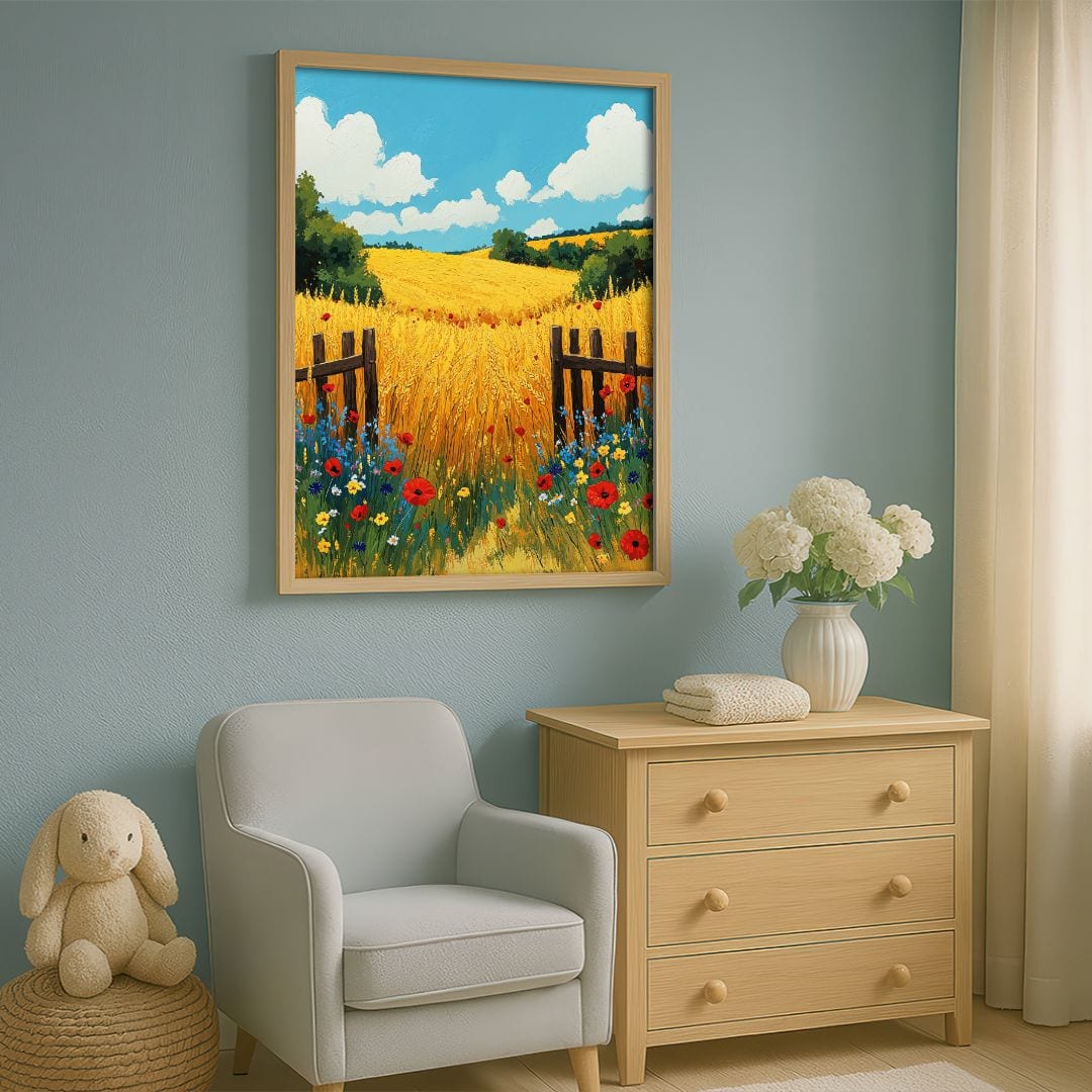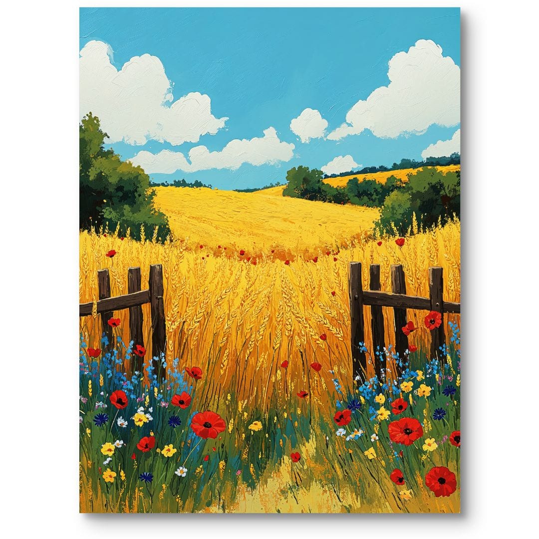 Ten impresjonistyczny plakat ukazuje malowniczy, sielski krajobraz, w którym przeważają rozległe pola jęczmienia oraz maków. Centralnym elementem kompozycji jest złote, subtelnie falujące na wietrze zboże, tworzące harmonijną całość z soczyście zielonymi wzgórzami na horyzoncie. Intensywnie czerwone maki oraz błękitne chabry dodają głębi i energii tej letniej scenerii. Całość dopełnia jasne, błękitne niebo z leniwie przesuwającymi się obłokami, przywołując atmosferę beztroskiego, ciepłego dnia.