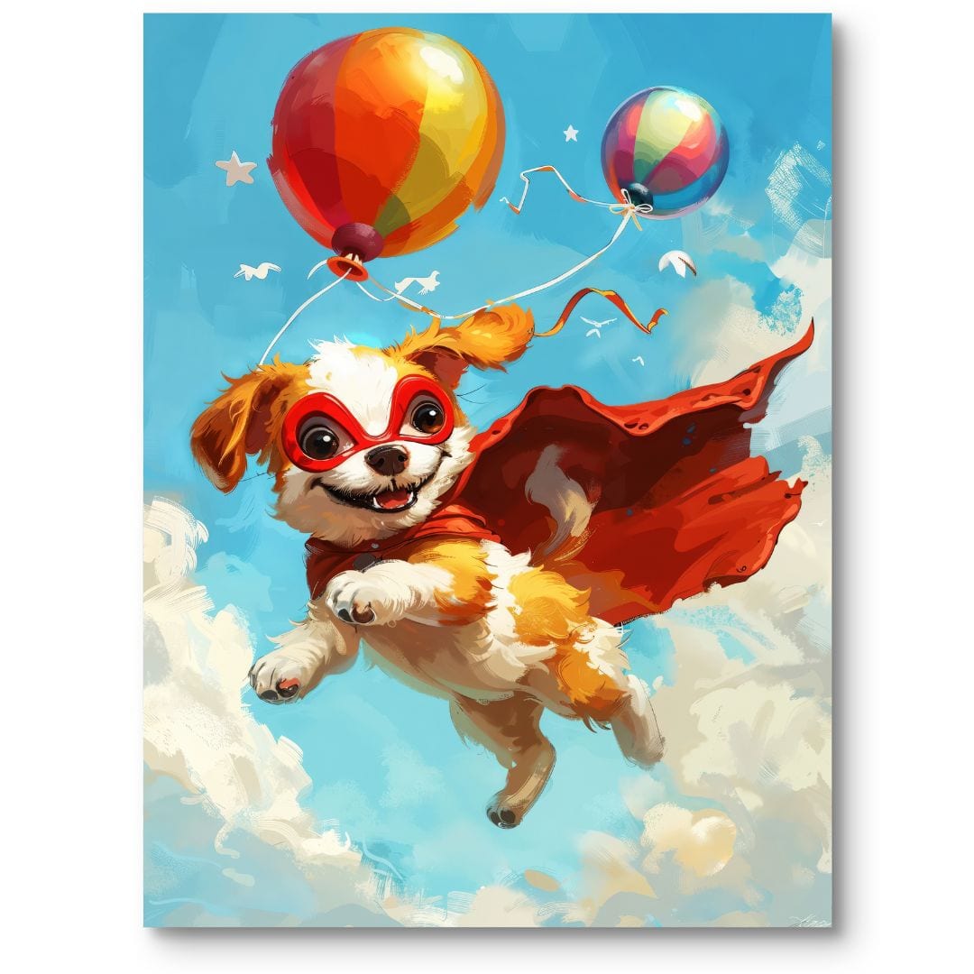 Ten barwny plakat przedstawia wesołego pieska w stroju superbohatera, unoszącego się ponad chmurami dzięki kolorowym balonom. Pomysłowa kompozycja pełna jest energii, ruchu oraz humoru, co sprawia, że z łatwością wywoła uśmiech zarówno u dzieci, jak i dorosłych. Wyraziste kolory i stylizowane ukazanie zwierzęcia podkreślają beztroską, radosną atmosferę plakatu.