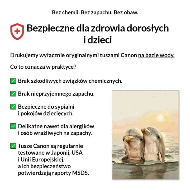 Tak, absolutnie! Drukujemy wyłącznie certyfikowanymi, bezwonnymi tuszami pigmentowymi Canon Lucia Pro na bazie wody. Są one w pełni bezpieczne dla zdrowia, nie zawierają rozpuszczalników i mogą być bez obaw stosowane w sypialniach i pokojach dziecięcych.