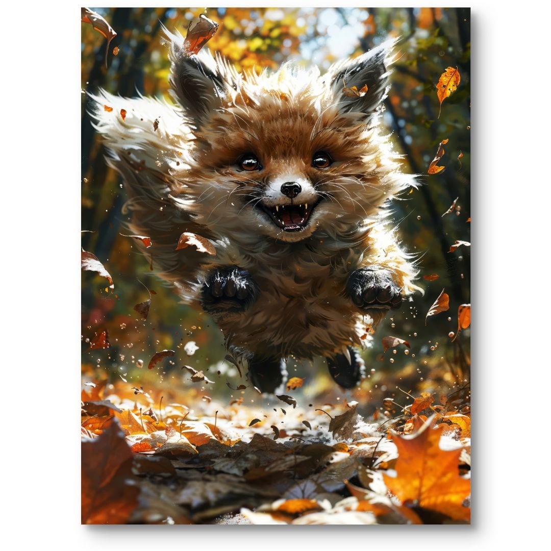 Plakat ukazuje dynamicznie skaczącego lisa pośród złocistych liści, w pełnej uroku jesiennej scenerii. Zwierzę przedstawiono niezwykle realistycznie, z dbałością o każdy detal – niemal czuć miękkość jego futra i energię ruchu. Sympatyczna postać lisa oraz otaczająca go jesienna aura budują ciepły, przyjazny nastrój, który natychmiast przywołuje uśmiech i pozytywne emocje.