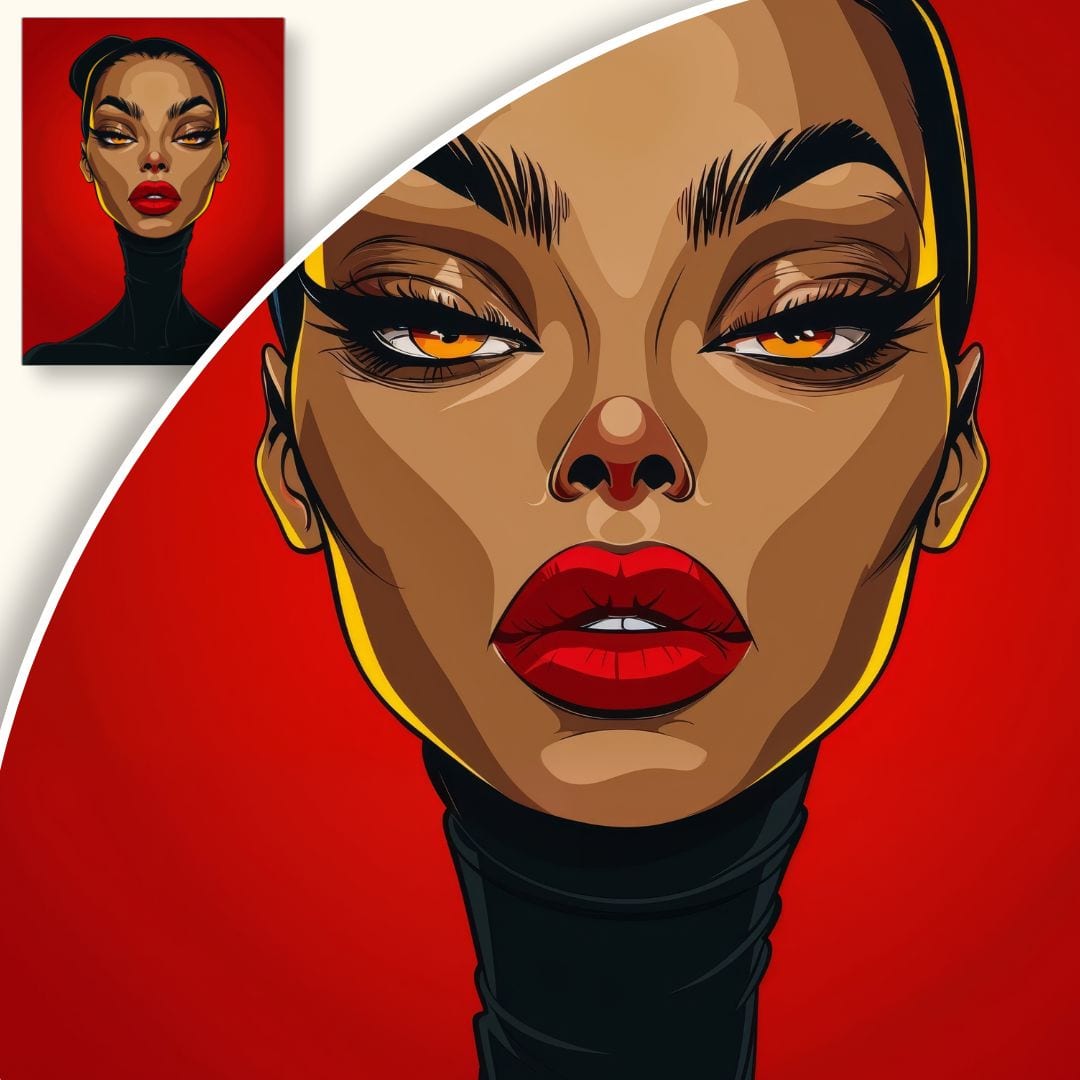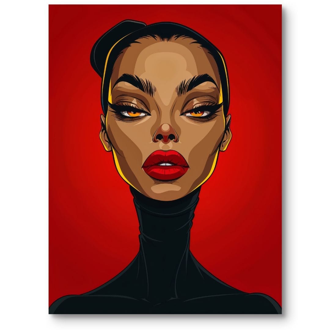 Ten wyjątkowy plakat prezentuje dynamiczny portret kobiety w intensywnym stylu pop-art. Na pierwszy plan wysuwa się twarz o zdecydowanych rysach, z przyciągającymi wzrok dużymi oczami oraz intensywnie czerwonymi ustami. Soczyście czerwone tło potęguje dramatyzm sceny i wnosi do wnętrza artystyczną energię.