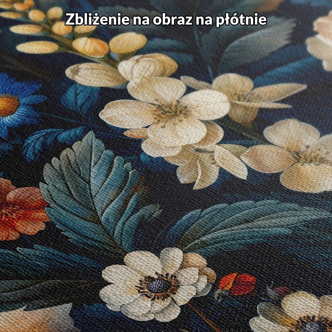 Prezentowany plakat to prawdziwe święto natury – urzekające bogactwem detali, realistyczne przedstawienie różnych gatunków kwiatów. Wiodącą rolę odgrywają tu głębokie granatowe liście, które tworzą eleganckie tło dla intensywnych pomarańczowych, subtelnych białych i chłodnych niebieskich kwiatów. Całość emanuje spokojem, dając poczucie relaksu i harmonii.