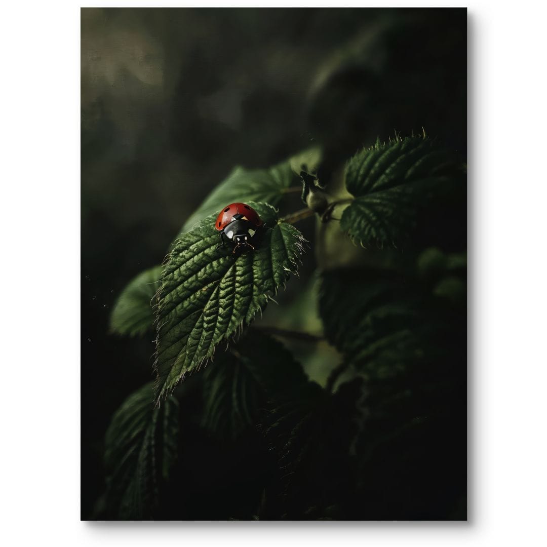 Kompozycja została zbudowana w taki sposób, by spojrzenie widza nieuchronnie zatrzymywało się na biedronce. Głębokie zielenie liścia i tła kontrastują z intensywną czerwienią owada, a subtelna gra światła wydobywa trójwymiarowość i barwę, nadając całości świeżości i głębi.