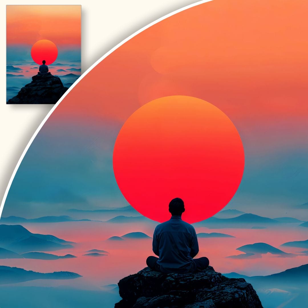 Ten niezwykły plakat ukazuje samotną postać siedzącą na szczycie góry, zatopioną w kontemplacji monumentalnego, pomarańczowo-czerwonego słońca. W tle rozciągają się bajkowe grzbiety gór, tworząc niecodzienny, pełen spokoju i magii pejzaż.