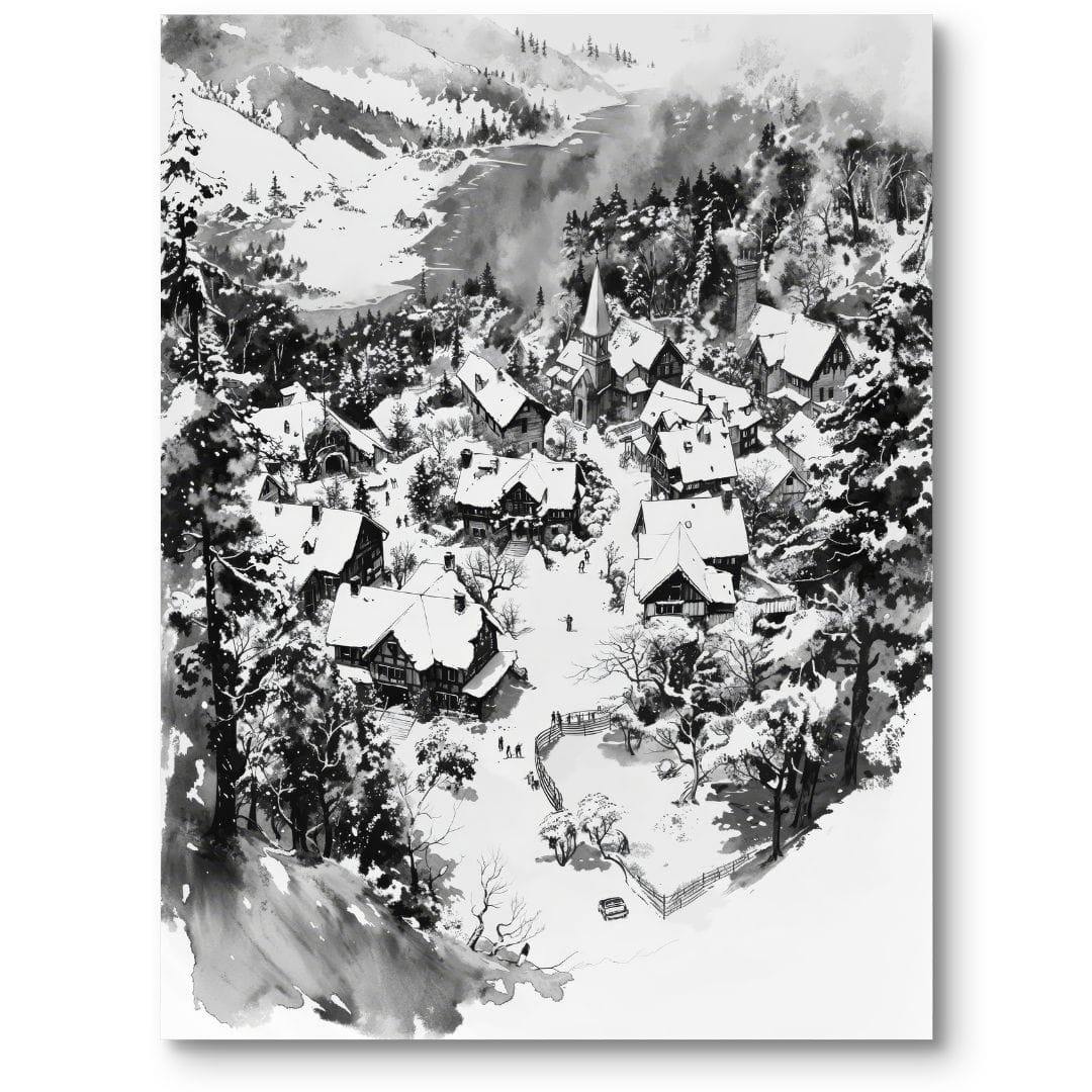 Ten wyjątkowy plakat przedstawia malownicze, zimowe miasteczko, pełne uroku i nostalgii. W centrum kompozycji znajduje się niewielka wieś z domkami pokrytymi śnieżnobiałym puchem, otoczona majestatycznymi górami i zaśnieżonymi drzewami. Cała scena tchnie ciepłem i wspomnieniem dawnych, spokojnych zim, tworząc niepowtarzalną, sentymentalną atmosferę.