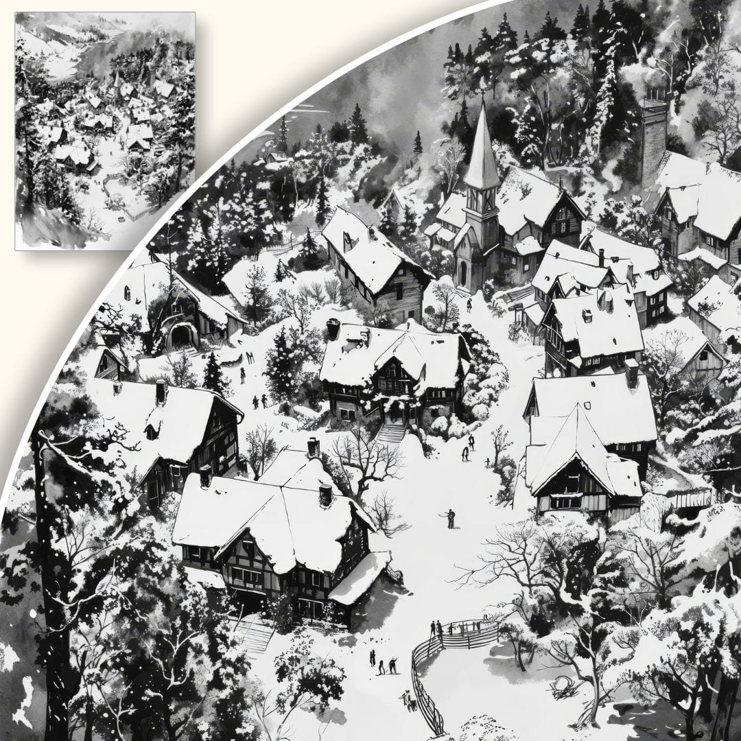 Rysunki tuszem cieszą się popularnością od setek lat – już w XIX wieku artyści tacy jak Ivan Shishkin czy Karl Bodmer wykorzystywali tę technikę do tworzenia realistycznych pejzaży. Plakat zimowego miasteczka nawiązuje do tradycji ilustrowania codziennego życia poza miastem, wzbogacając ją o współczesną dbałość o detal.