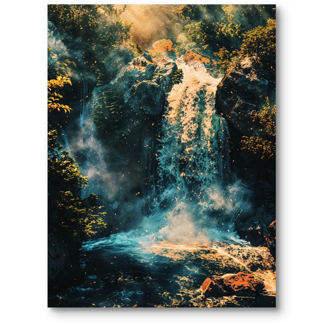 Harmonijna i wyważona kompozycja wyraźnie eksponuje wodospad jako centralny motyw plakatu. Oświetlenie gra tu kluczową rolę – promienie słońca prześwitujące przez liście podkreślają fakturę wody oraz barwność otaczającej roślinności. Bogata paleta – od chłodnych błękitów wodospadu, przez głęboką zieleń, po złote refleksy słońca – tworzy klimat spokoju, świeżości i pozytywnej energii.