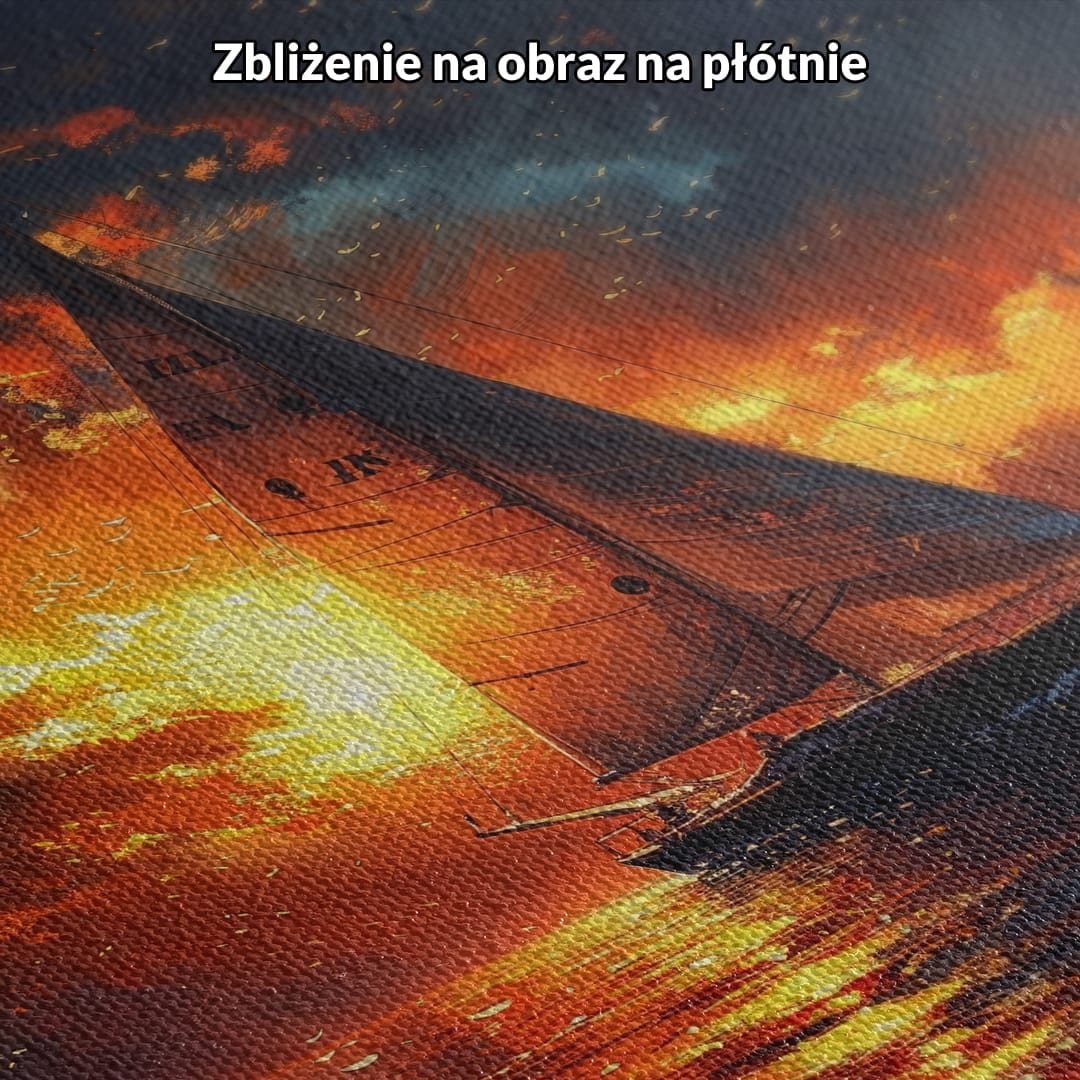 Ten wyjątkowy plakat uchwyca magiczny moment rejsu żaglówką po spokojnej tafli wody podczas niesamowitego zachodu słońca. Nieboskłon wypełniają dynamiczne chmury, rozświetlone słonecznym, ciepłym światłem w odcieniach pomarańczy i złota. Całość dopełnia subtelna obecność księżyca przydająca tej scenie nuty mistycyzmu i spokoju. Kontrast pomiędzy ogniście zachodzącym słońcem a delikatnym światłem księżyca tworzy niepowtarzalny klimat pełen tajemnic i refleksji.