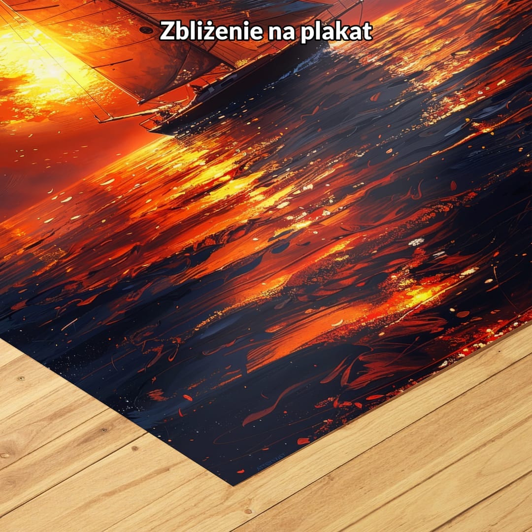 Motyw żeglugi i zachodu słońca od wieków pojawia się w sztuce, symbolizując tęsknotę za przygodą, wolność oraz momenty refleksji. W podobnej tematyce swoje dzieła tworzyli tak znani artyści jak Ivan Aivazovsky – mistrz morskich pejzaży – czy William Turner, który słynął z niezwykłej gry światła w swoich obrazach. Plakat ten wprowadza motyw podróży na nieznane wody do codziennego otoczenia, wywołując uczucie spokoju i inspiracji.
