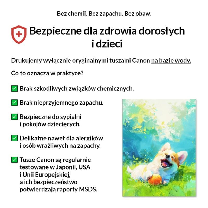 Tak, absolutnie! Drukujemy wyłącznie certyfikowanymi, bezwonnymi tuszami pigmentowymi Canon Lucia Pro na bazie wody. Są one w pełni bezpieczne dla zdrowia, nie zawierają rozpuszczalników i mogą być bez obaw stosowane w sypialniach i pokojach dziecięcych.