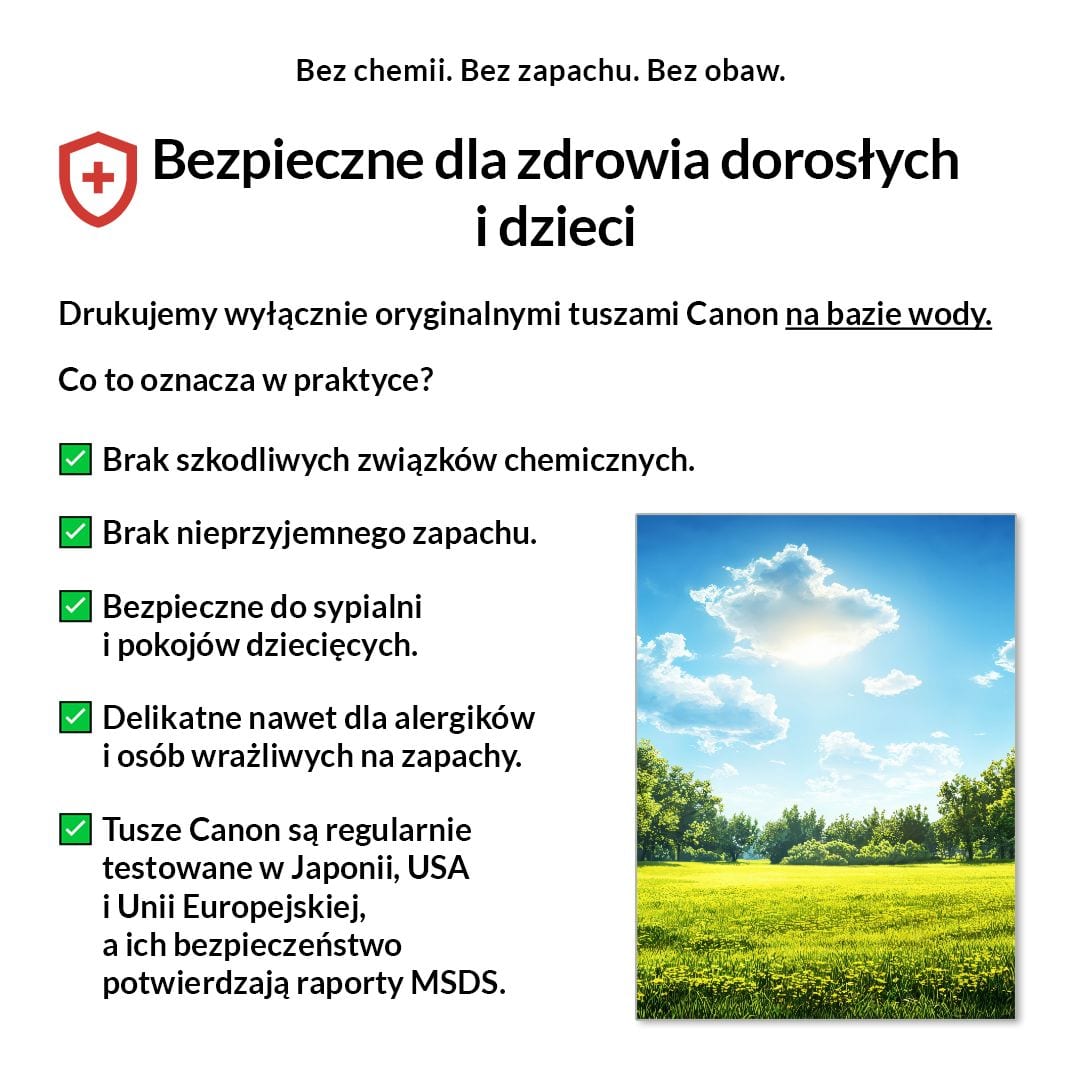 Tak, absolutnie! Drukujemy wyłącznie certyfikowanymi, bezwonnymi tuszami pigmentowymi Canon Lucia Pro na bazie wody. Są one w pełni bezpieczne dla zdrowia, nie zawierają rozpuszczalników i mogą być bez obaw stosowane w sypialniach i pokojach dziecięcych.