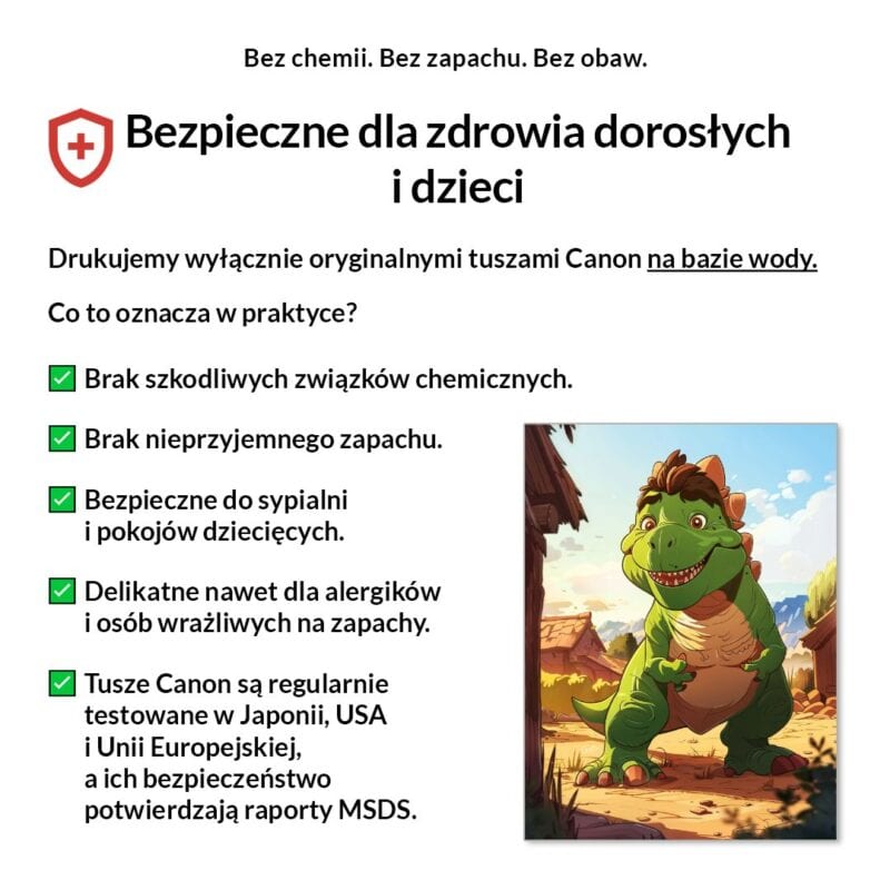 Tak, absolutnie! Drukujemy wyłącznie certyfikowanymi, bezwonnymi tuszami pigmentowymi Canon Lucia Pro na bazie wody. Są one w pełni bezpieczne dla zdrowia, nie zawierają rozpuszczalników i mogą być bez obaw stosowane w sypialniach i pokojach dziecięcych.