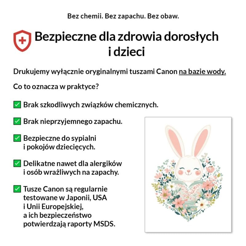 Tak, absolutnie! Drukujemy wyłącznie certyfikowanymi, bezwonnymi tuszami pigmentowymi Canon Lucia Pro na bazie wody. Są one w pełni bezpieczne dla zdrowia, nie zawierają rozpuszczalników i mogą być bez obaw stosowane w sypialniach i pokojach dziecięcych.